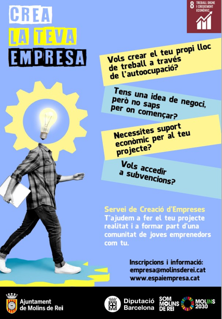 Servei de Creació d’Empresa Ajuntament de Molins de Rei, t’ajudem a fer el teu projecte realitat i a formar part d’una comunitat de joves emprenedors/es com tu.